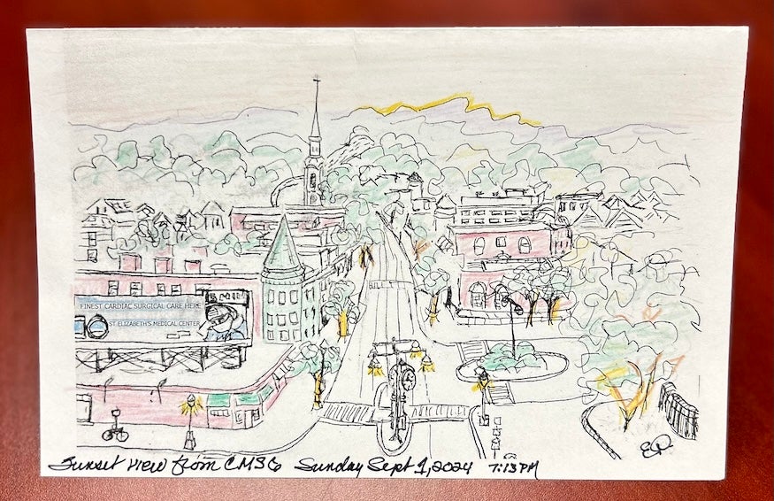 An artist by training, Eliza began sketching that landscape during their stay. The drawing would be turned into a card and sent, alongside a deeply personal thank-you card, to the care team—both of which are now framed on Dr. Tam’s desk.